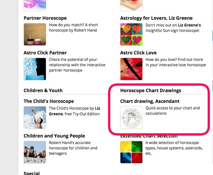8. Now scroll down, and on the lower-right hand column beneath where it says “Horoscope Chart Drawings,” click “Chart Drawing, Ascendant” (as seen below)